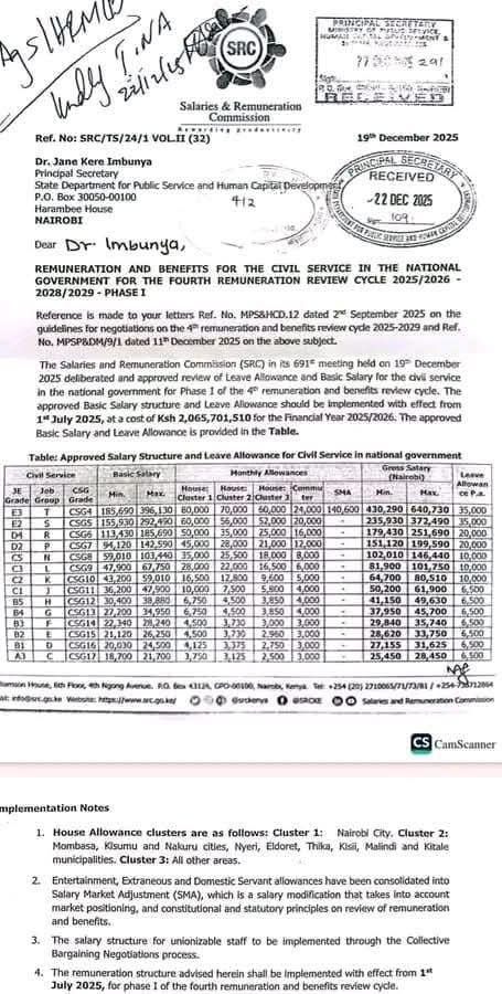 The Kenya Salaries and Remuneration Commission (SRC) has approved an increment for civil servants across the country. The approval was granted during its 691st meeting held on 19 December 2025 and took effect on 1 July 2025, at a cost of KSh 2,065,701,510 for the 2025/2026 Financial Year.